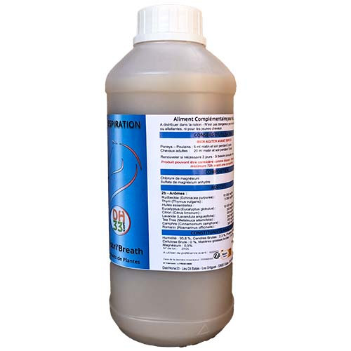 Cet aliment complémentaire liquide possède une solide base d'huiles essentielles permettant de faire face efficacement contre les petites infections respiratoires de l'hiver notamment la toux de votre cheval.